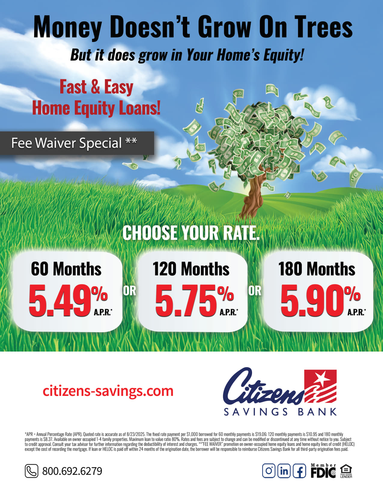 Home Equity *APR = Annual Percentage Rate (APR). Quoted rate is accurate as of 8/23/25. The fixed rate payment per $1,000 borrowed for 60 monthly payments is $19.06; 120 monthly payments is $10.95 and 180 monthly payments is $8.37. Available on owner occupied 1-4 family properties. Maximum loan to value ratio 80%. Rates and fees are subject to change and can be modified or discontinued at any time without notice to you. Subject to credit approval. Consult your tax advisor for further information regarding the deductibility of interest and charges. **”FEE WAIVER” promotion on owner-occupied home equity loans and home equity lines of credit (HELOC) except the cost of recording the mortgage. If loan or HELOC is paid off within 24 months of the origination date, the borrower will be responsible to reimburse Citizens Savings Bank for all third-party origination fees paid.