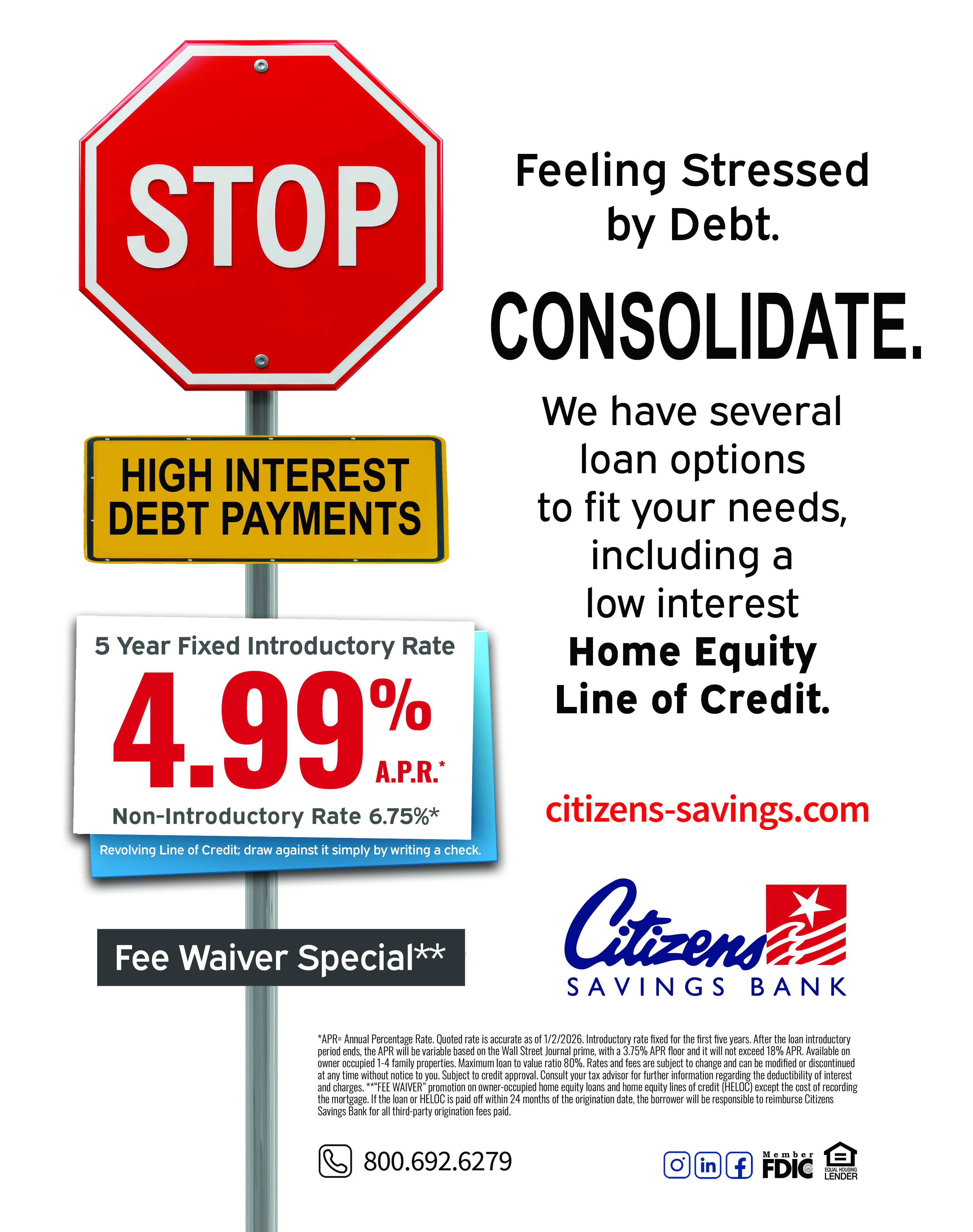 Home Equity Line of Credit *APR= Annual Percentage Rate (APR). Quoted rate is accurate as of 01/02/2026. Introductory rate is fixed for the first five years. After the loan introductory period ends, the APR will be variable based on the Wall Street Journal prime, with a 3.75% APR floor and it will not exceed 18% APR. Available on owner occupied 1-4 family properties. Maximum loan to value ratio 80%. Rates and fees are subject to change and can be modified or discontinued at any time without notice to you. Subject to credit approval. Consult your tax advisor for further information regarding the deductibility of interest and charges. **"FEE WAIVER" promotion on owner-occupied home equity loans and home equity lines of credit (HELOC) except the cost recording the mortgage. If the loan or HELOC is paid off within 24 months of the origination date, the borrower will be responsible to reimburse Citizens Savings Bank for all third-party origination fees paid.