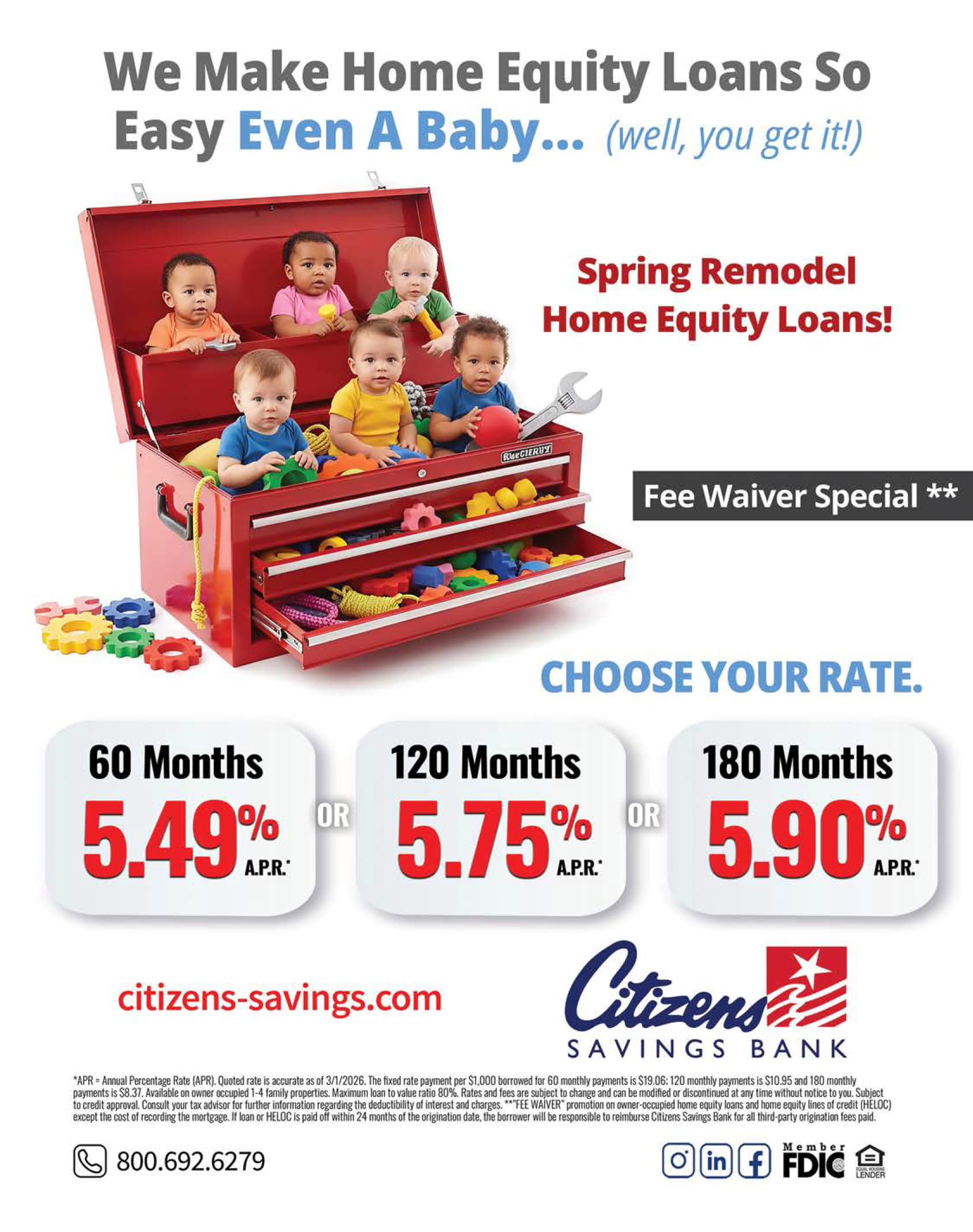 Home Equity *APR = Annual Percentage Rate (APR). Quoted rate is accurate as of 3/01/26. The fixed rate payment per $1,000 borrowed for 60 monthly payments is $19.06; 120 monthly payments are $10.95 and 180 monthly payments is $8.37. Available on owner occupied 1-4 family properties. Maximum loan to value ratio 80%. Rates and fees are subject to change and can be modified or discontinued at any time without notice to you. Subject to credit approval. Consult your tax advisor for further information regarding the deductibility of interest and charges. **"FEE WAIVER" promotion on owner-occupied home equity loans and home equity lines of credit (HELOC) except the cost of recording the mortgage. If loan or HELOC is paid off within 24 months of the origination date, the borrower will be responsible to reimburse Citizens Savings Bank for all third-party origination fees paid.